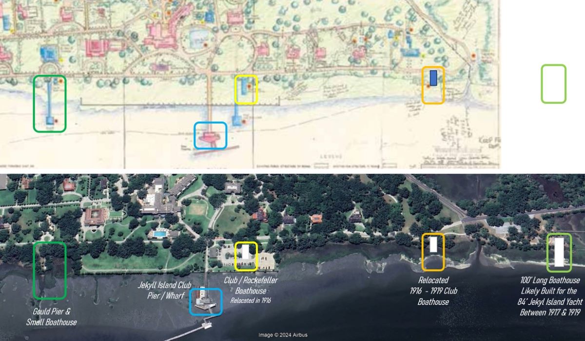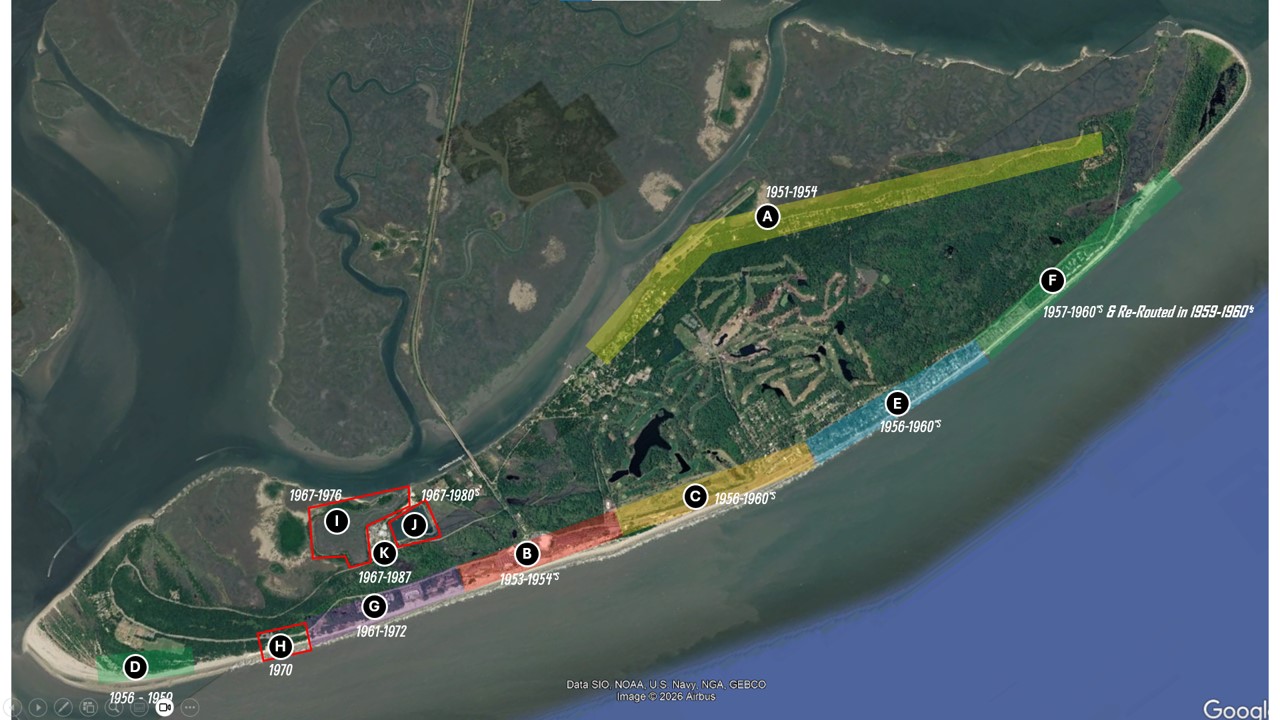 Reference the below image1, for readers who are not familiar with the overall ‘layout’ of Jekyll Island, I decided to start off with this satellite image of the Island. It is one I have used several times with different annotations throughout my State Era Segments to orient readers as to where the places I make mention of are located in relation to each other on seven-mile long and 1.5-mile wide island.